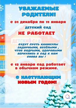 Уважаемые родители! Детский сад с 31 декабря по 11 января 2026 не работает! Поздравляем Вас с наступающим Новым годом, желаем здоровья, радости, счастья и благополучия! С 12 января детский сад работает в обычном режиме